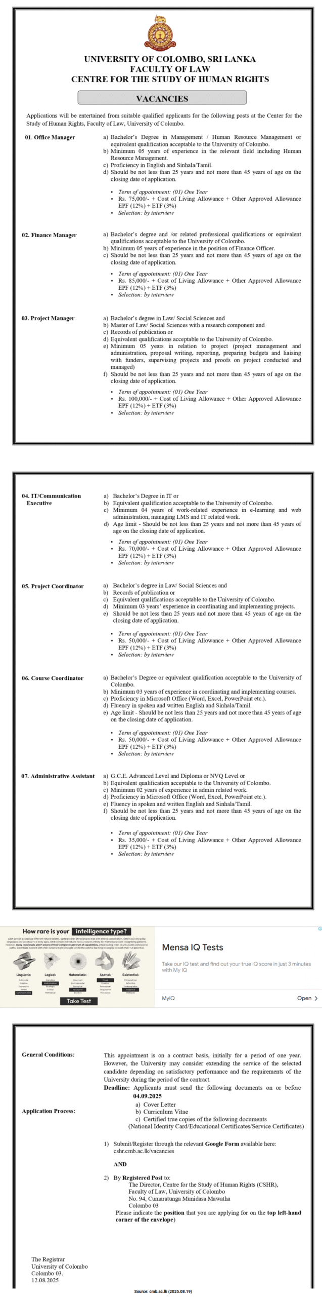 Discover career opportunities at the University of Colombo’s Centre for the Study of Human Rights. Apply now—roles for managers, IT, finance & more. Deadline 04-Sep-2025.